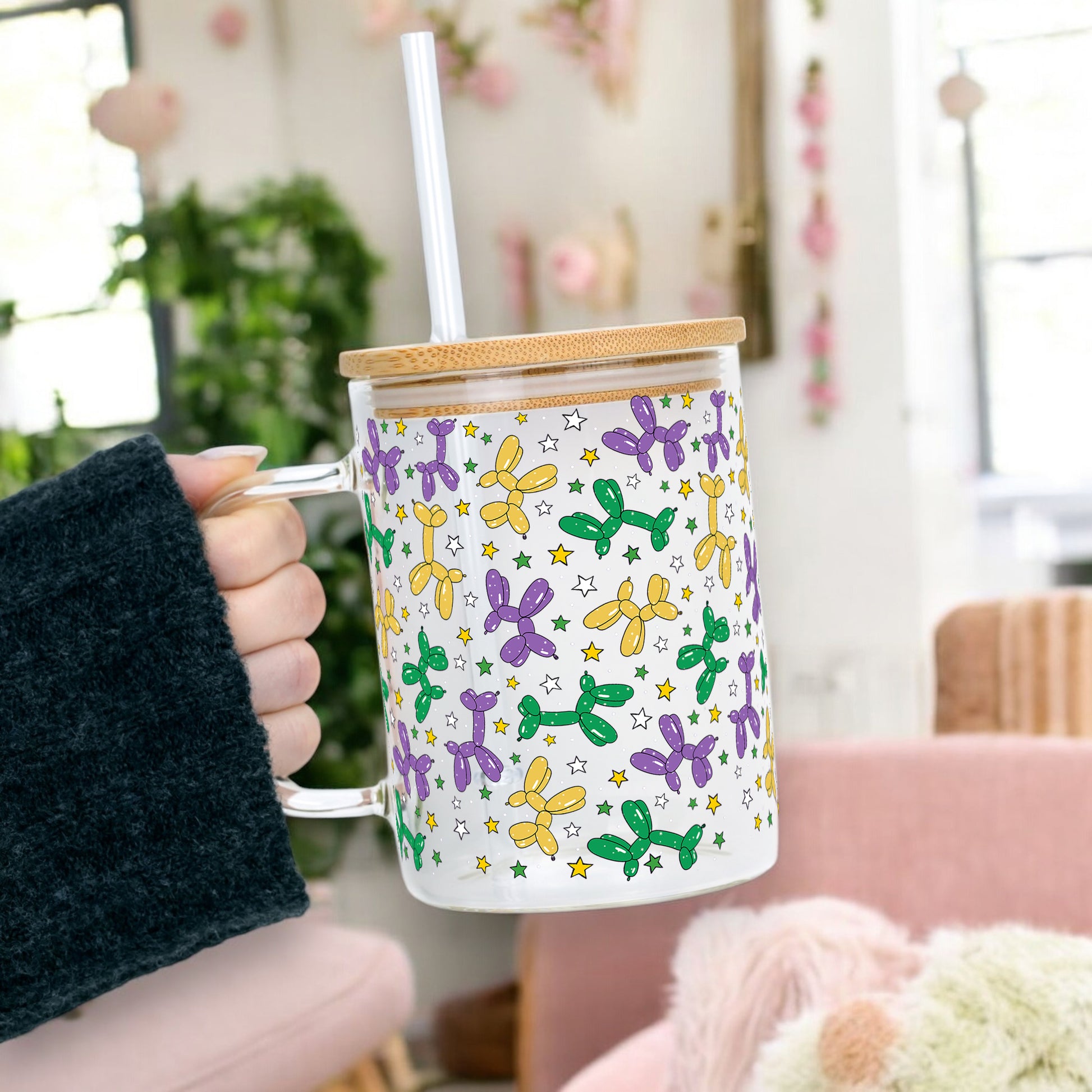 Balloon Dog Mardi Gras Clear Glass Mug with Lid & Straw