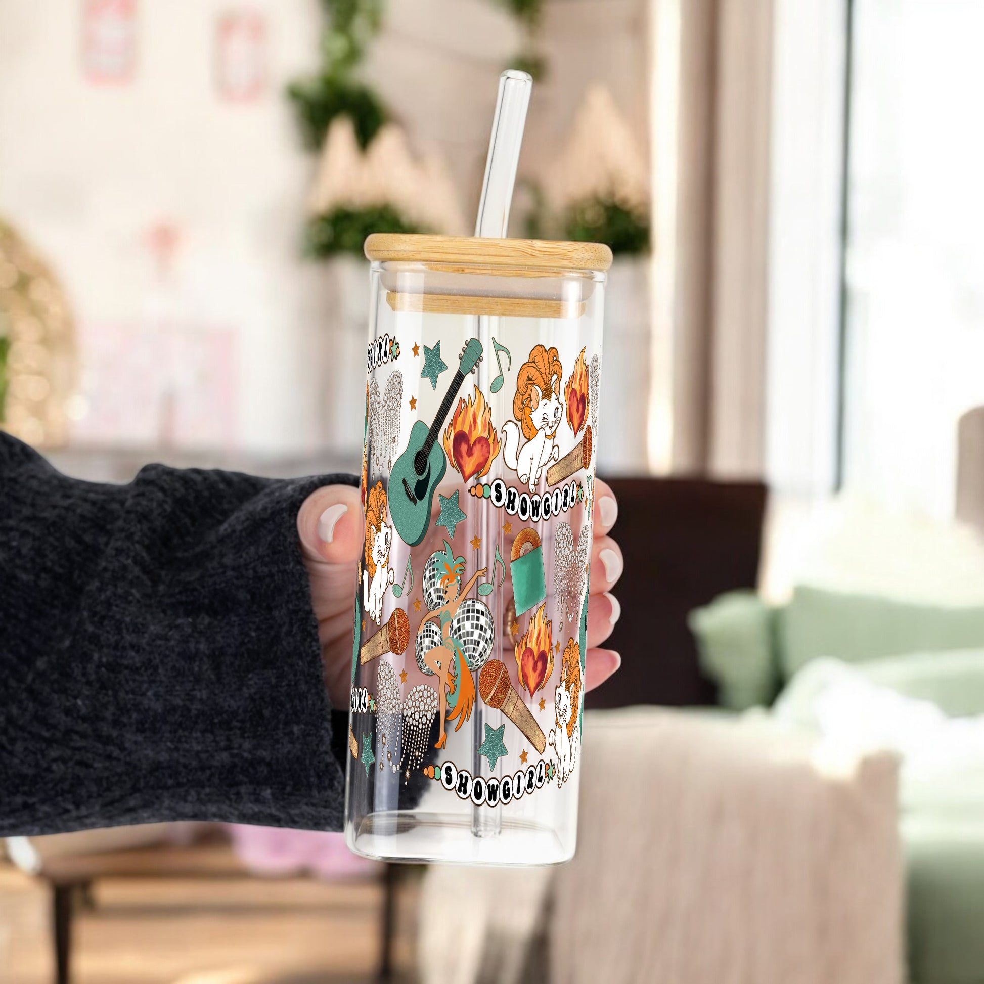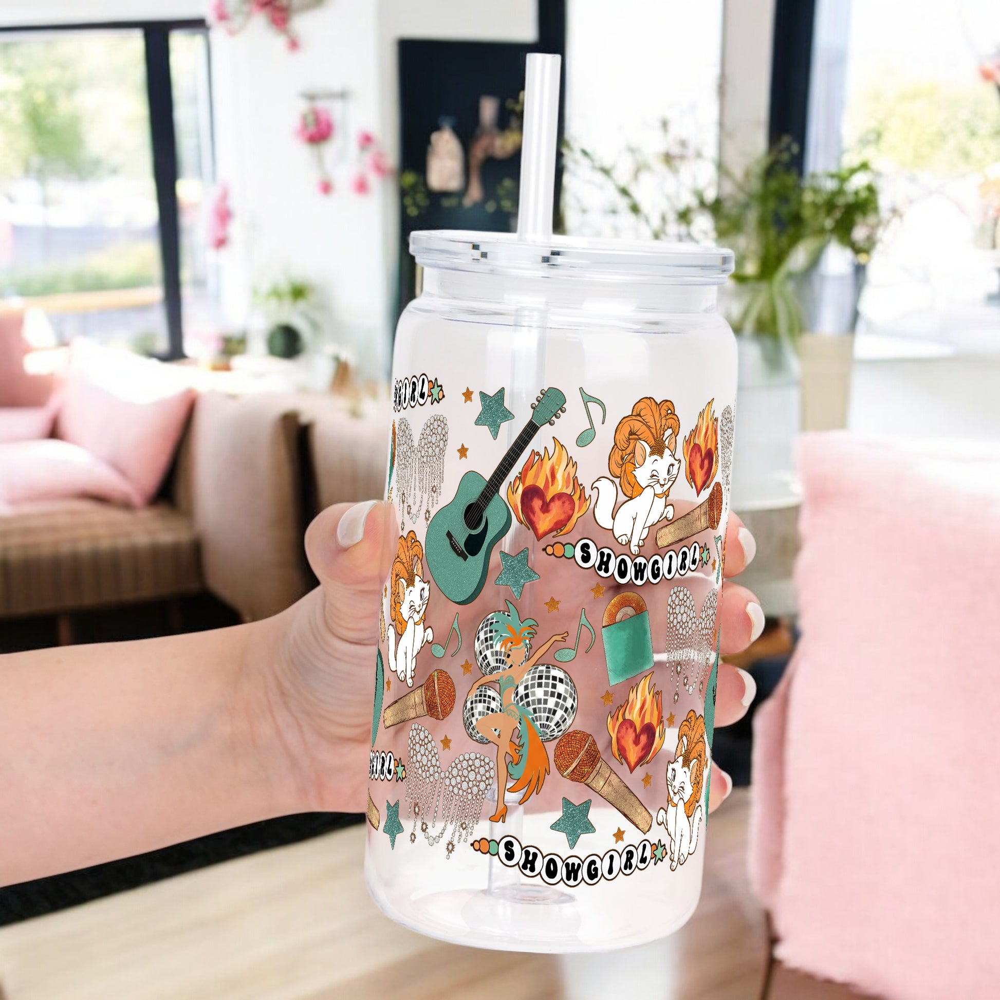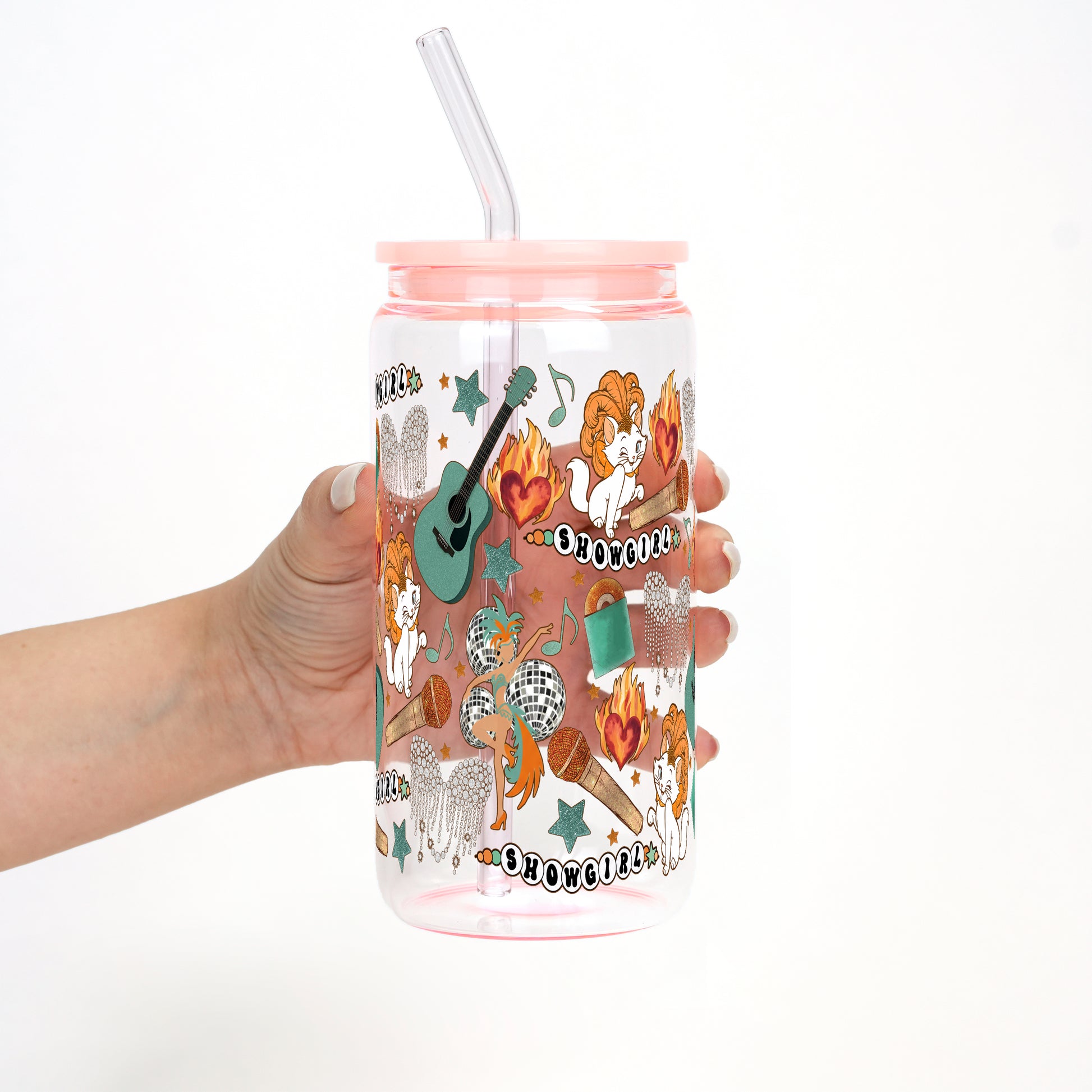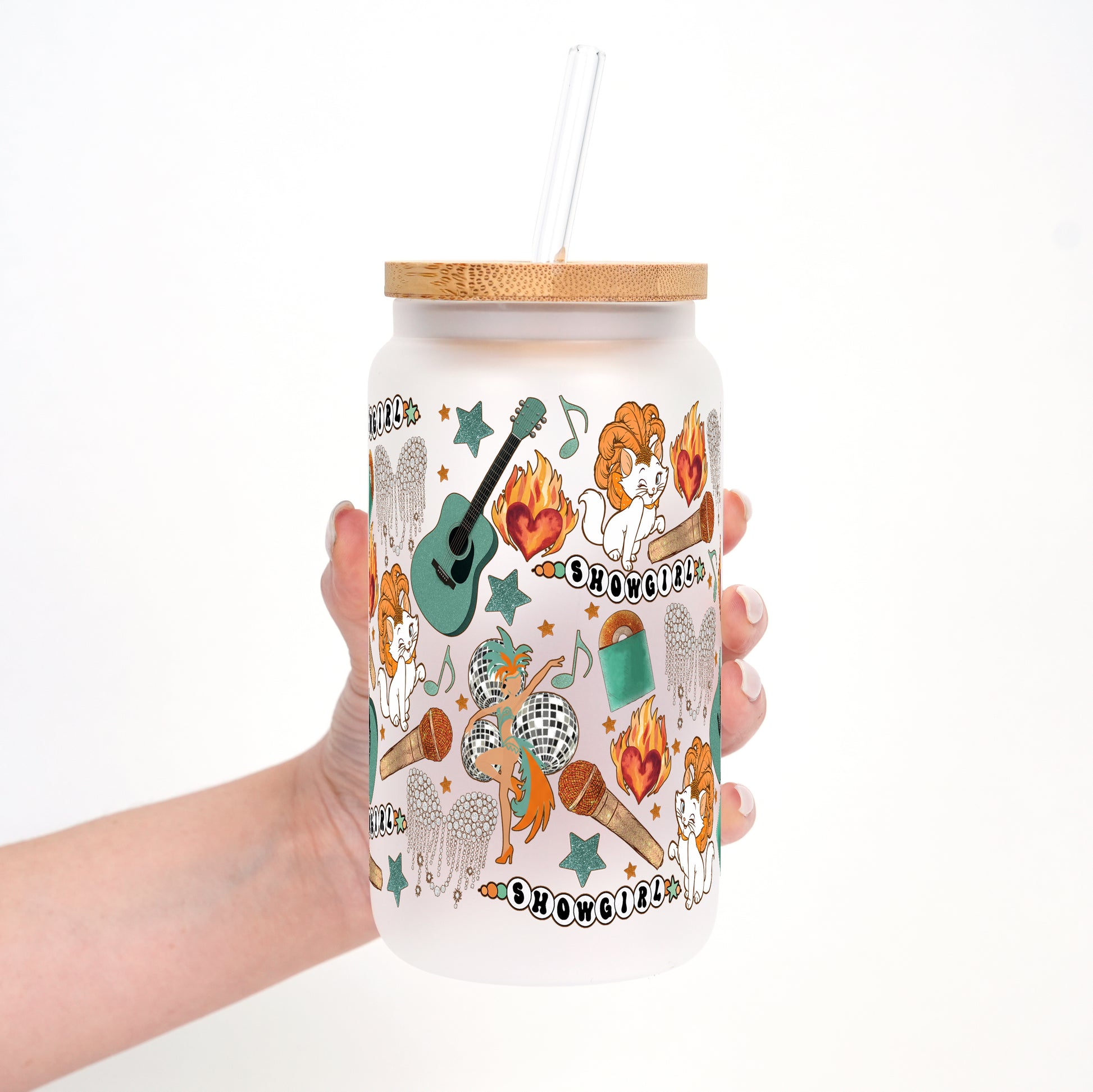 Our Showgirl cup design, features glittery guitars, rhinestone wings, fiery hearts, showgirl-inspired dancers, and sparkling microphones. It’s orange, it's bold, playful, and ready to shine wherever you go.