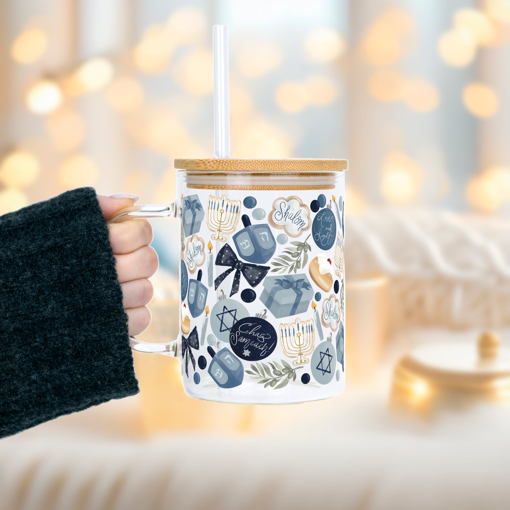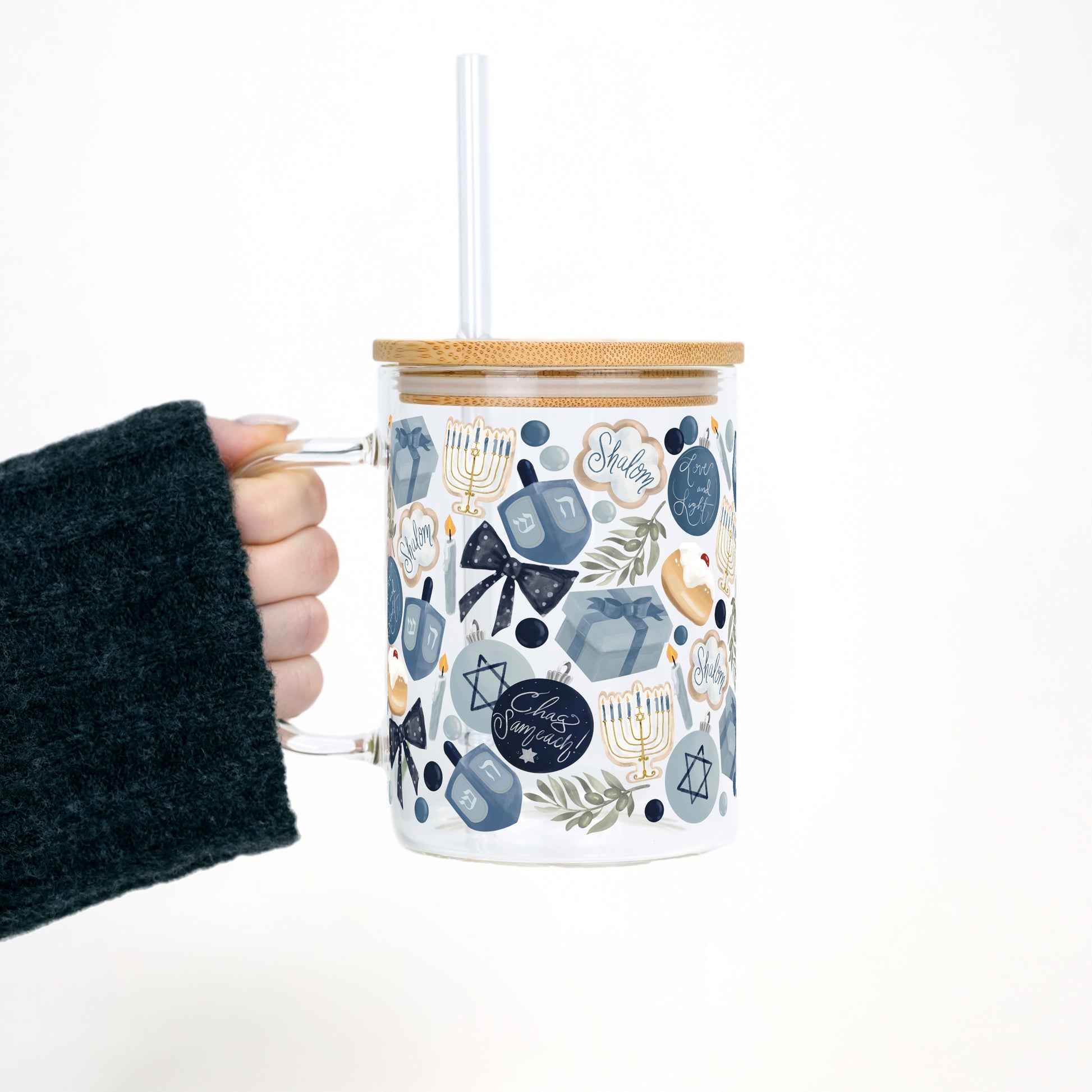 Cozy Hanukkah Glass Mug With Lid and Straw