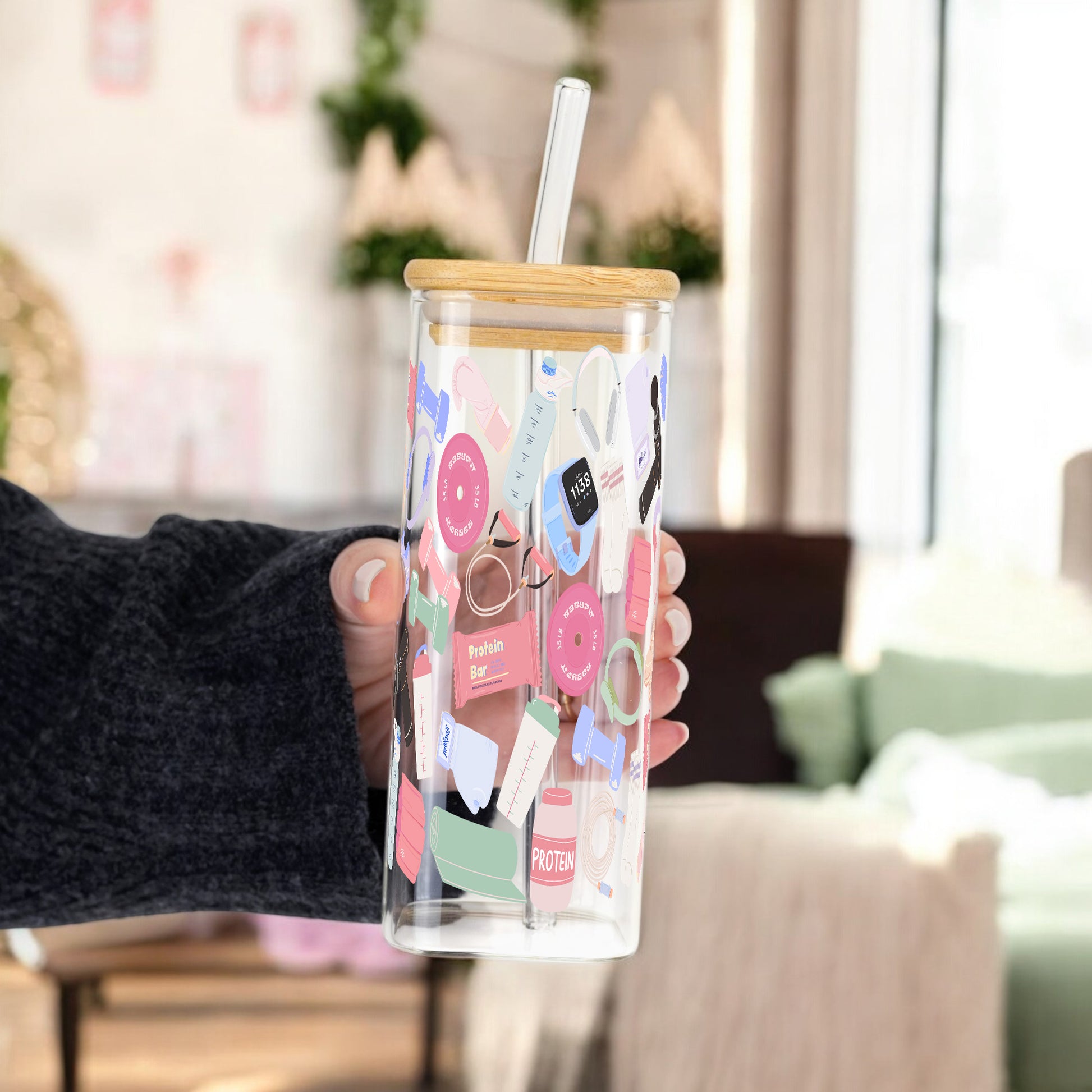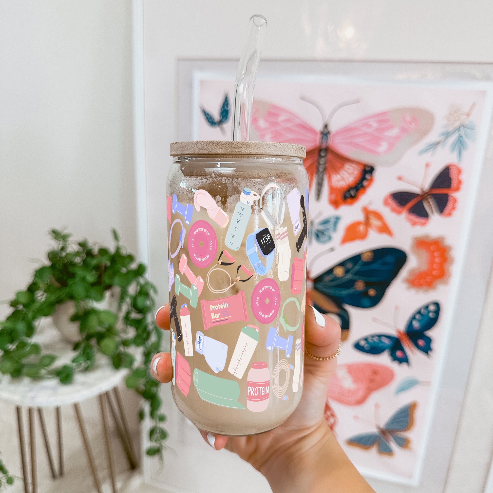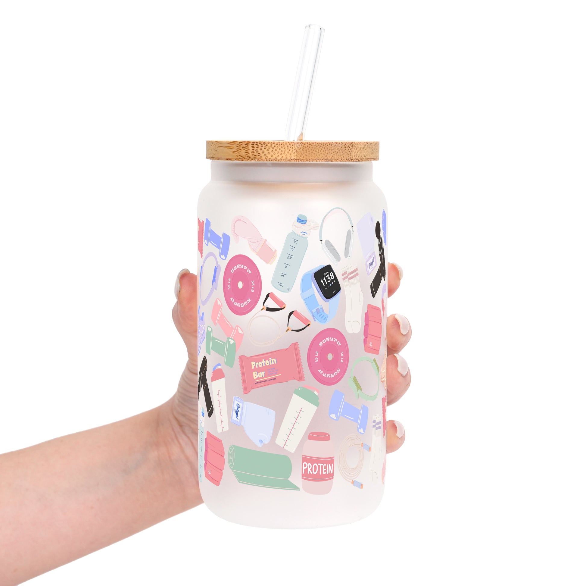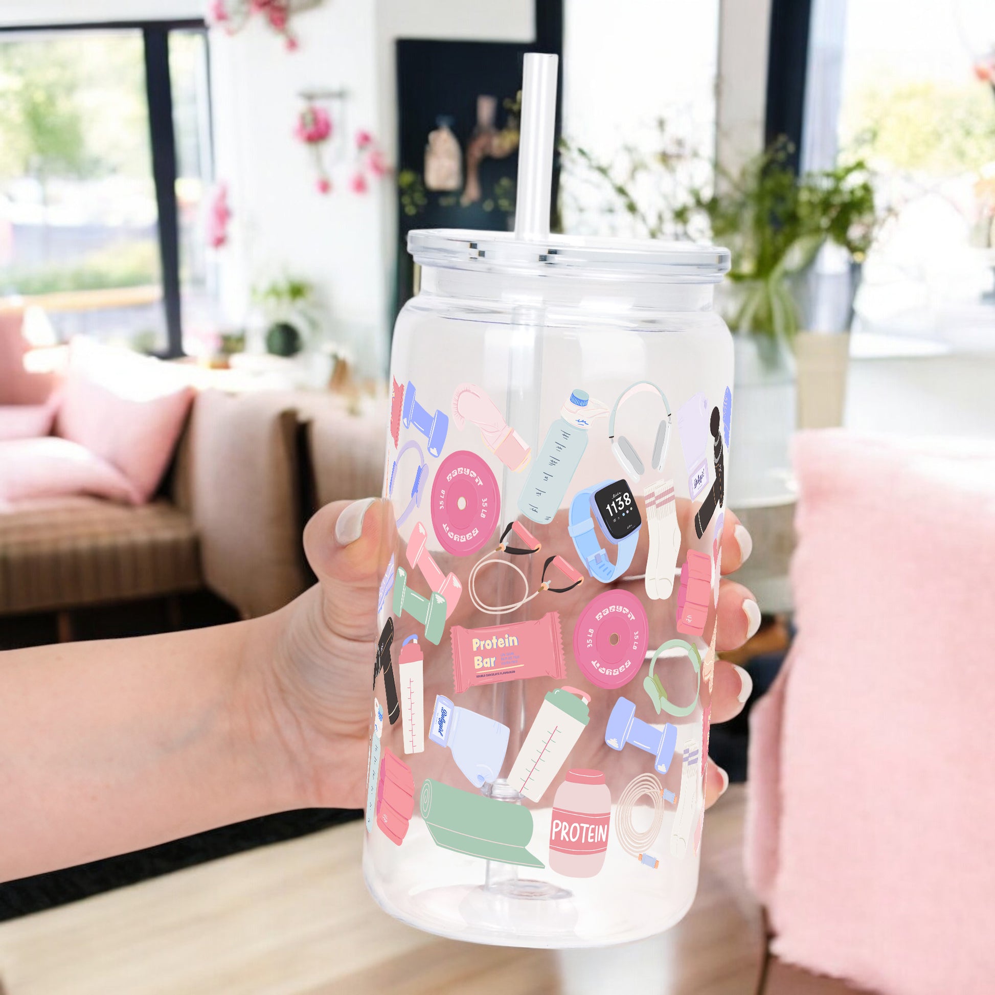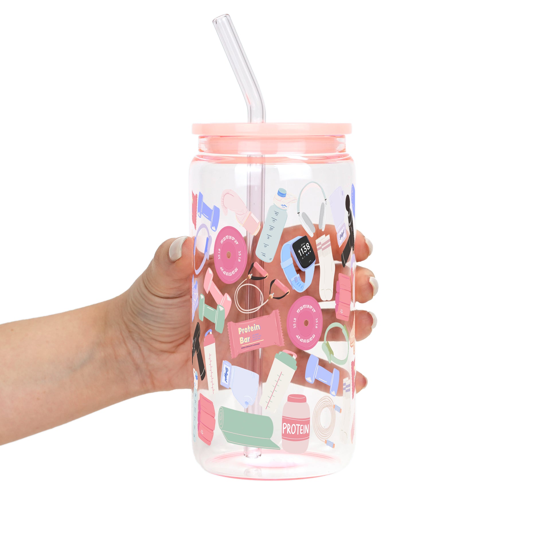 Our Gym Girly cup design features playful workout essentials, dumbbells, protein bars, yoga mats, sneakers, smart watches, and shaker bottles. All wrapped in soft, pastel vibes. It’s cute, motivated, and made for hot girl workouts, rest days, and everything in between.