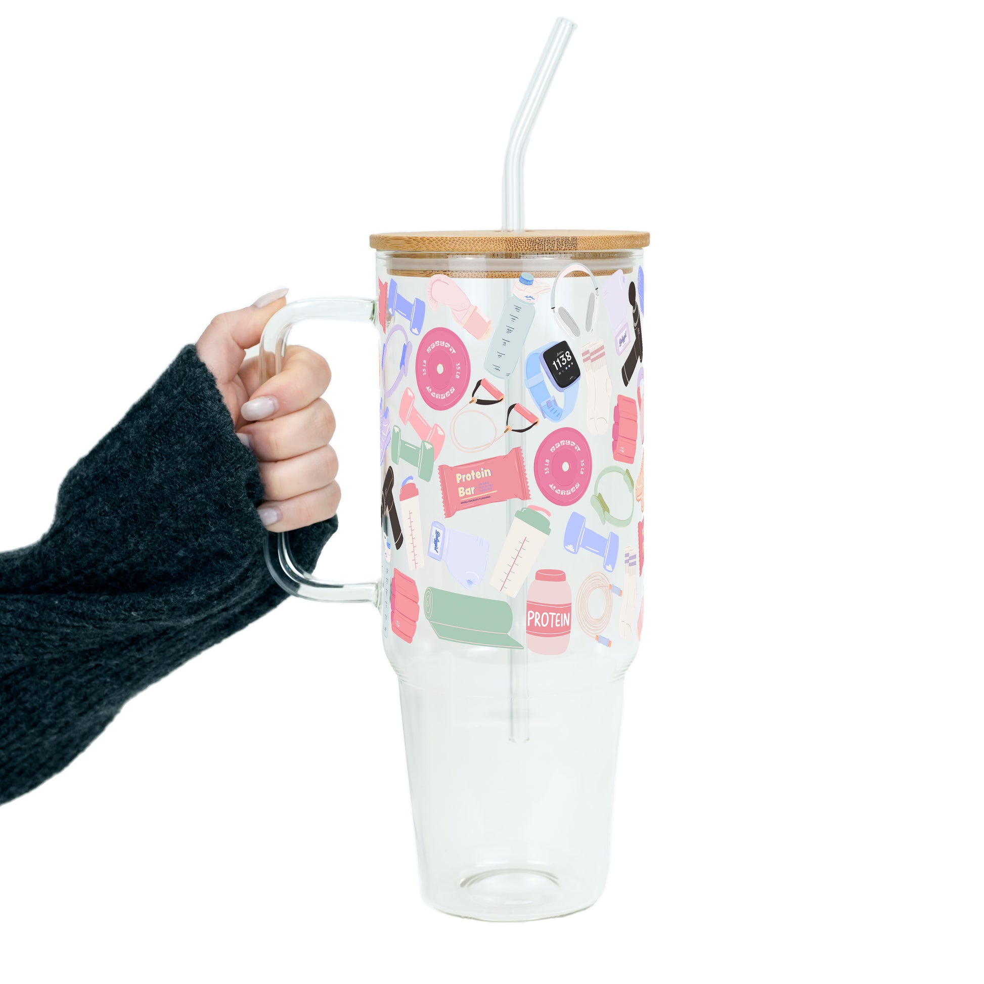 Our Gym Girly cup design features playful workout essentials, dumbbells, protein bars, yoga mats, sneakers, smart watches, and shaker bottles. All wrapped in soft, pastel vibes. It’s cute, motivated, and made for hot girl workouts, rest days, and everything in between.