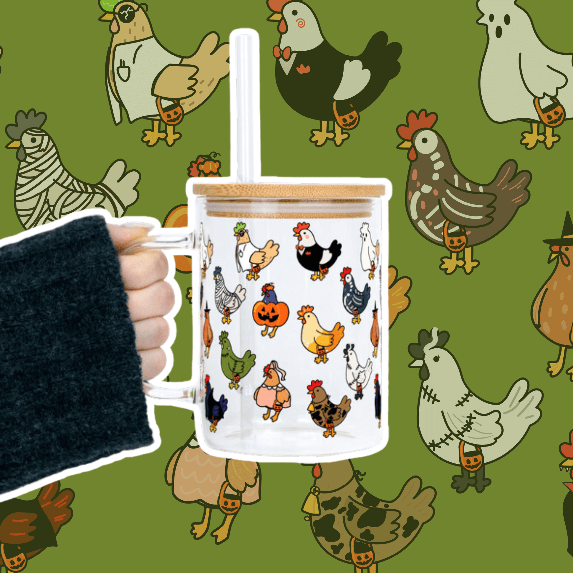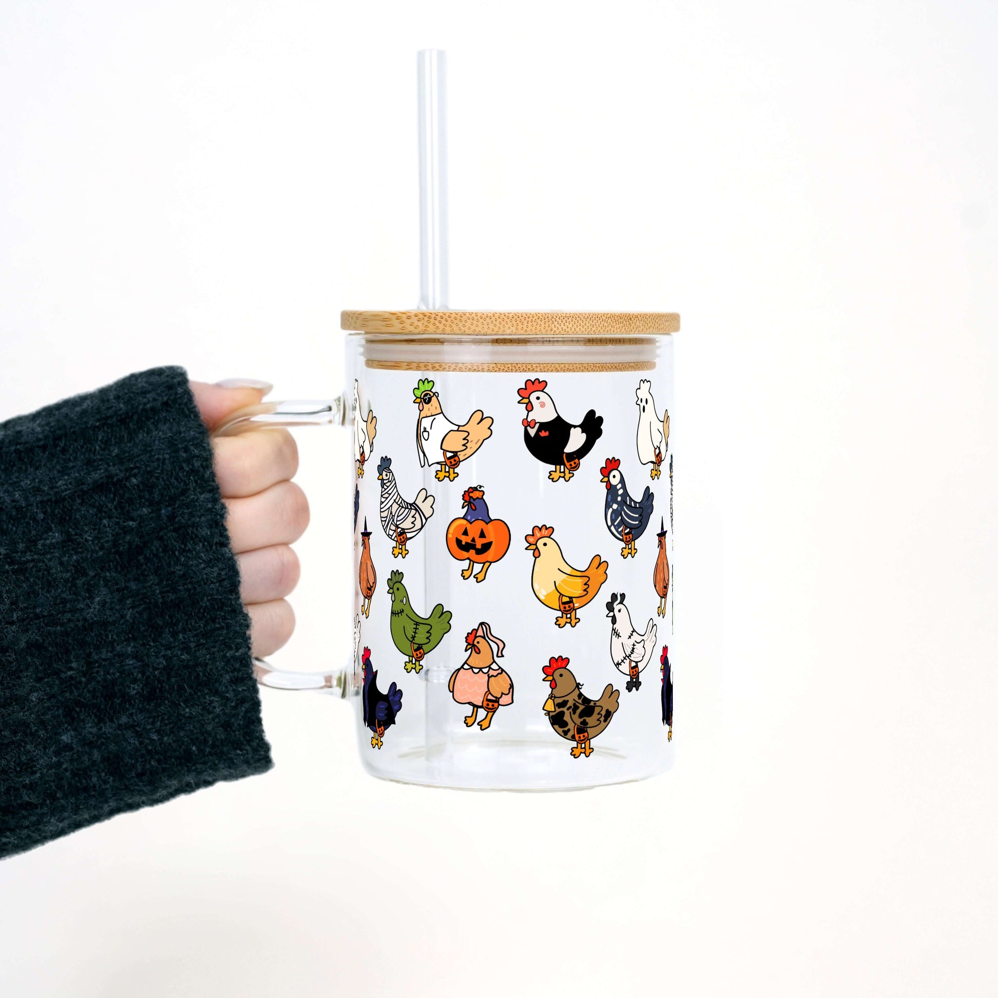 Spooky Chickens Clear Glass Mug With Lid and Straw