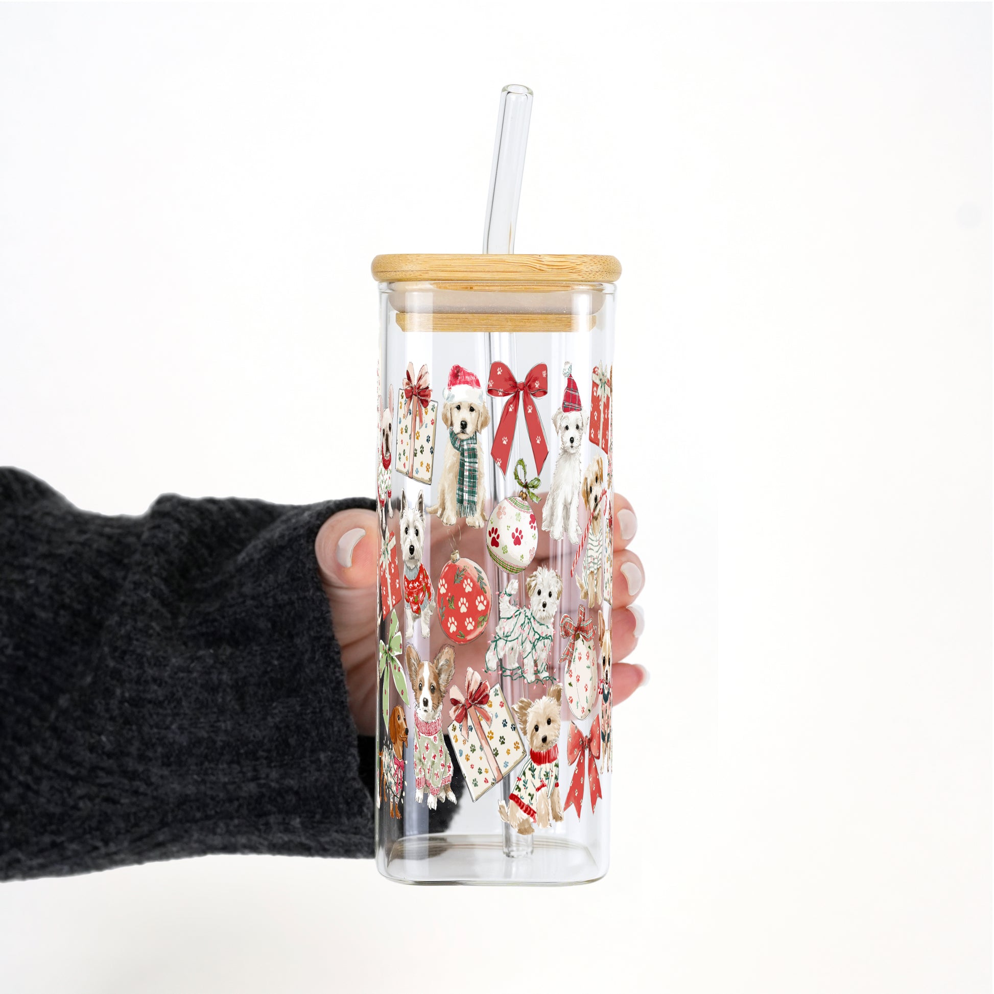 Get into the holiday spirit with this adorable glass can cup covered in festive pups! From dogs in Santa hats and plaid scarves to presents, ornaments, and bows, it’s a joyful mix of all things Christmas. Perfect for dog lovers and anyone who can’t resist a little seasonal cuteness.