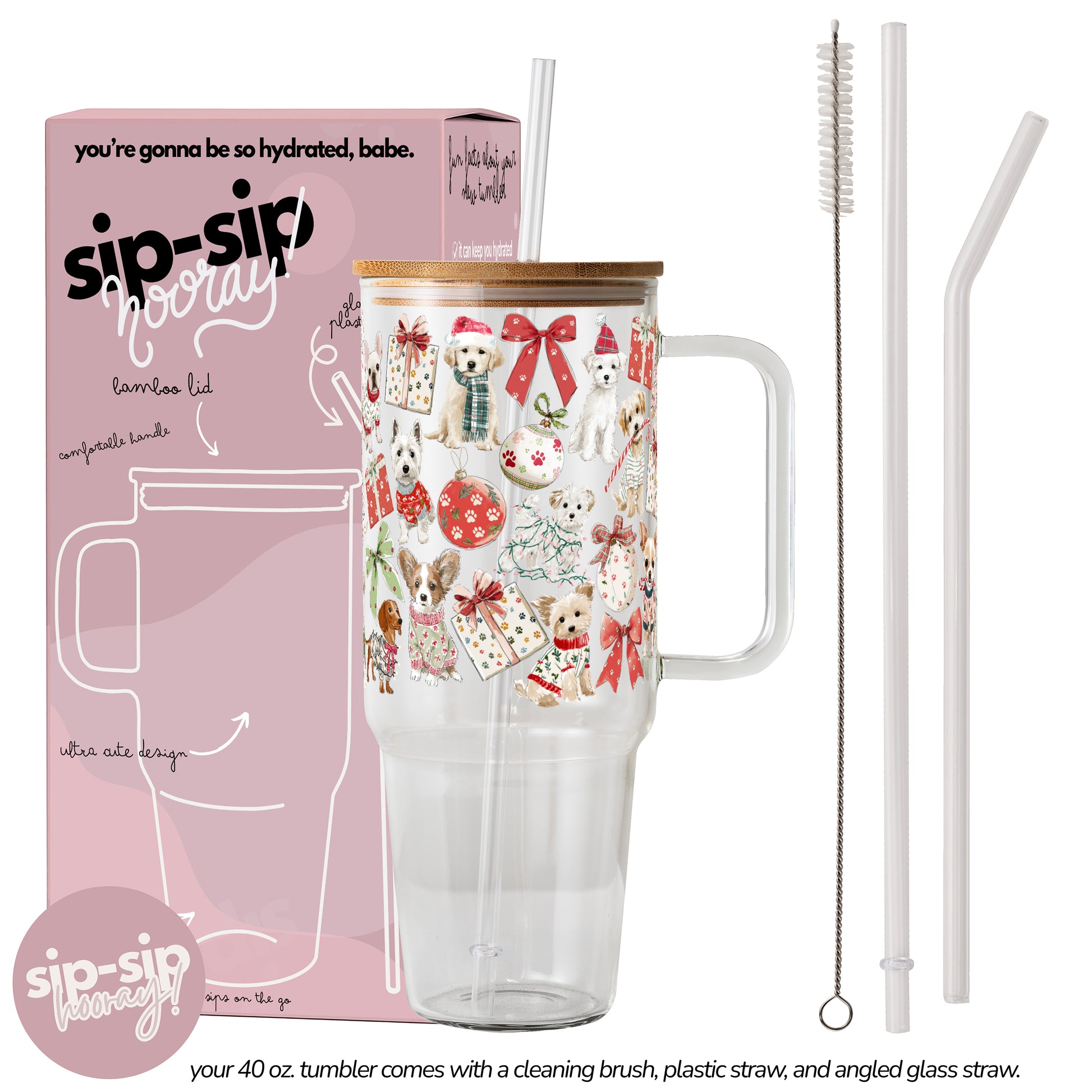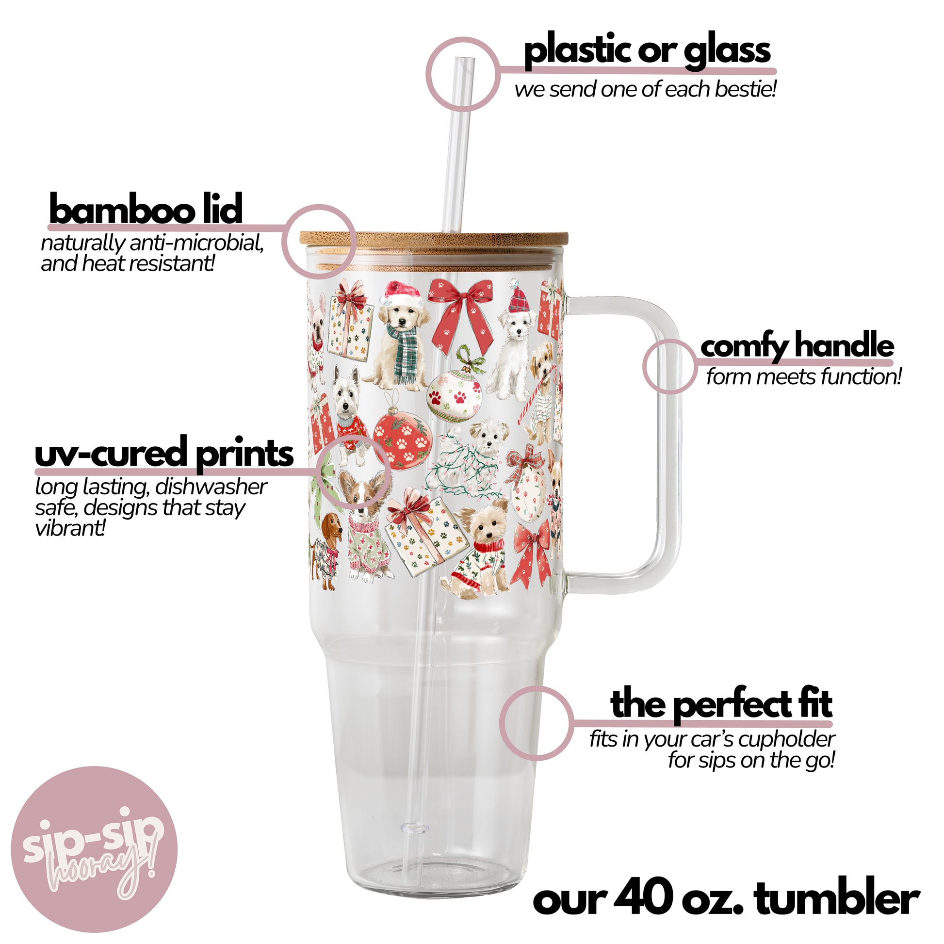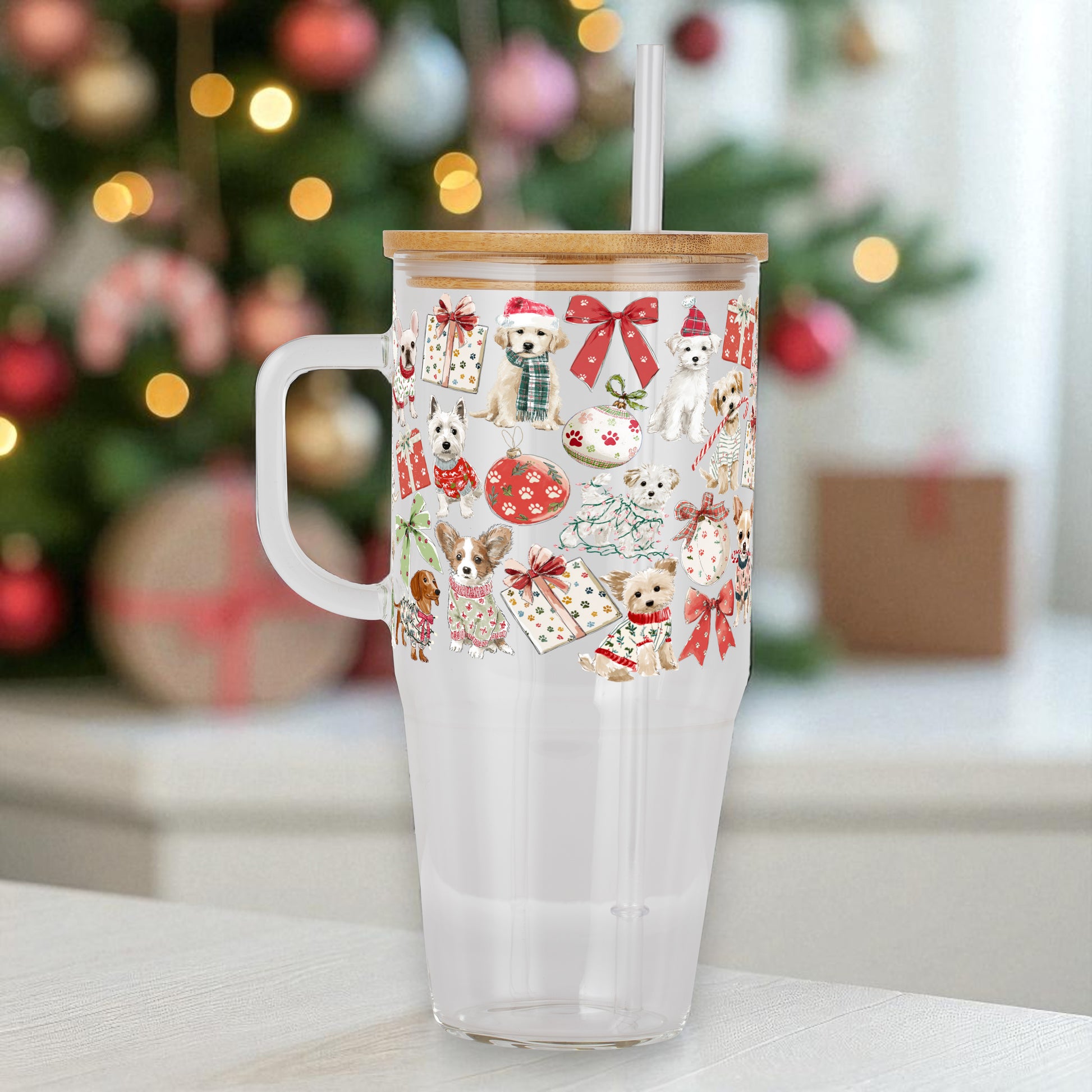 Get into the holiday spirit with this adorable glass can cup covered in festive pups! From dogs in Santa hats and plaid scarves to presents, ornaments, and bows, it’s a joyful mix of all things Christmas. Perfect for dog lovers and anyone who can’t resist a little seasonal cuteness.