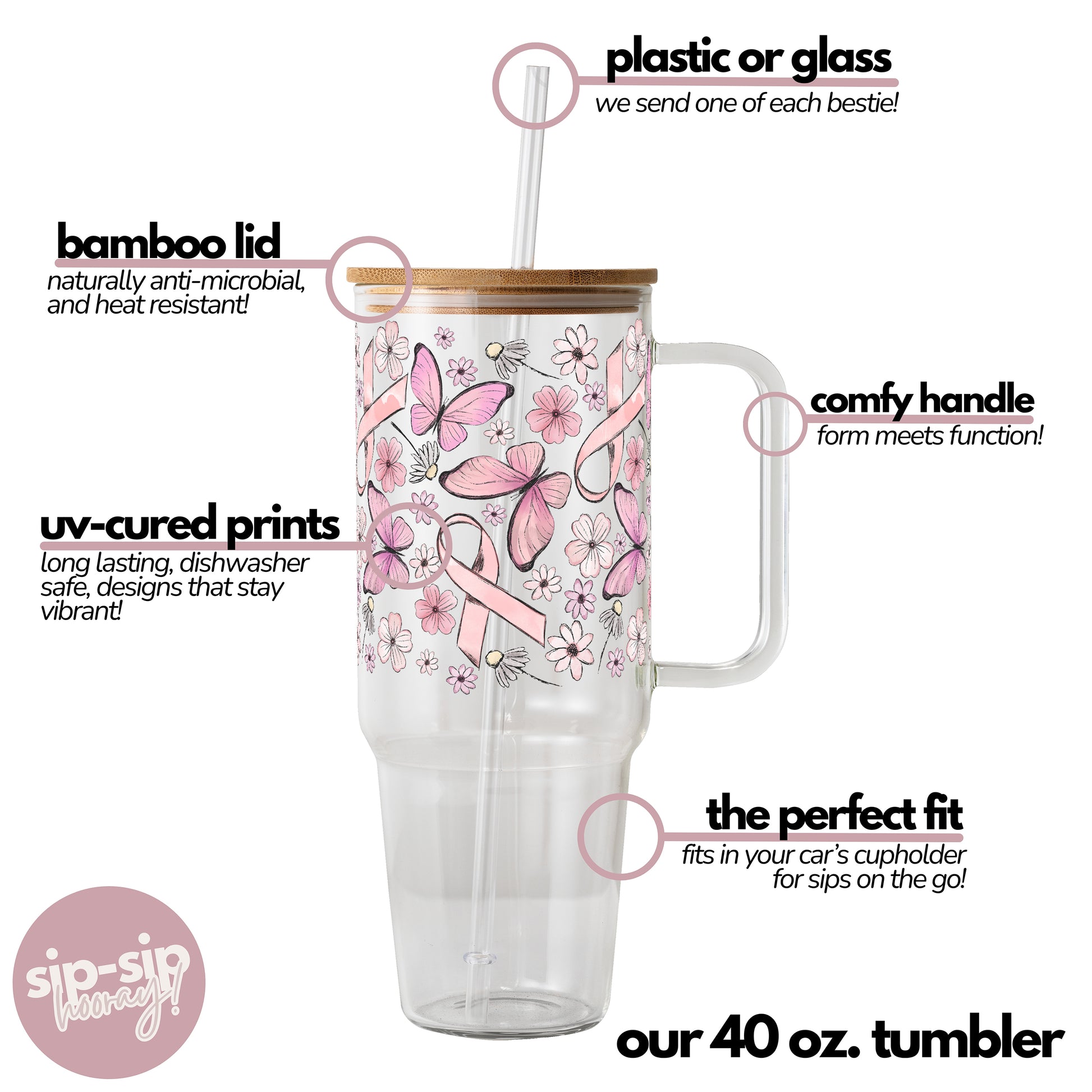 Pink Ribbon Tumbler With Lid and Straw