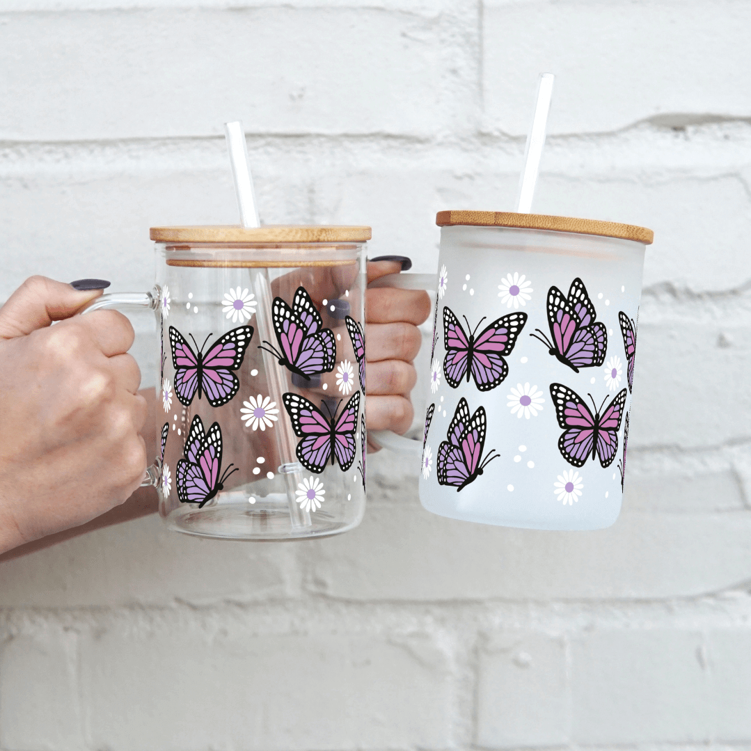 Purple Butterfly 17oz Glass Mug with Lid and Straw