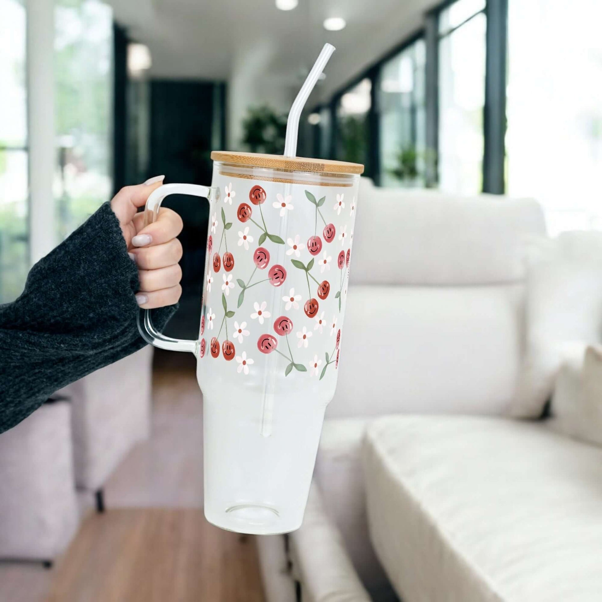Who knew cherries could be this cute? This Smiley Cherry Cup with a Lid and Straw is all about good vibes and playful charm, featuring adorable hand-drawn cherries with little smiley faces, scattered daisies, and a retro, feel-good aesthetic.